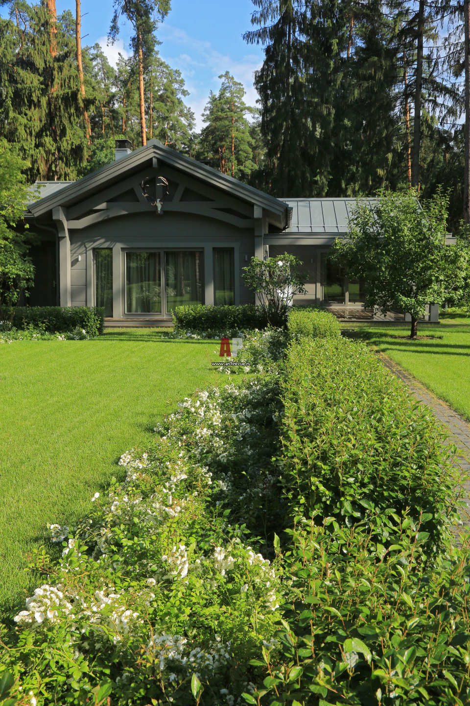 Мощеная дорога с аллеей из кустарников перед гостевым домом и яблоневым садом.