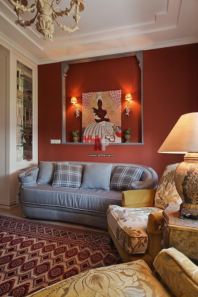 Мягкая зона в неоклассике. Лепной декор потолка рифмуется с оформление ниши.