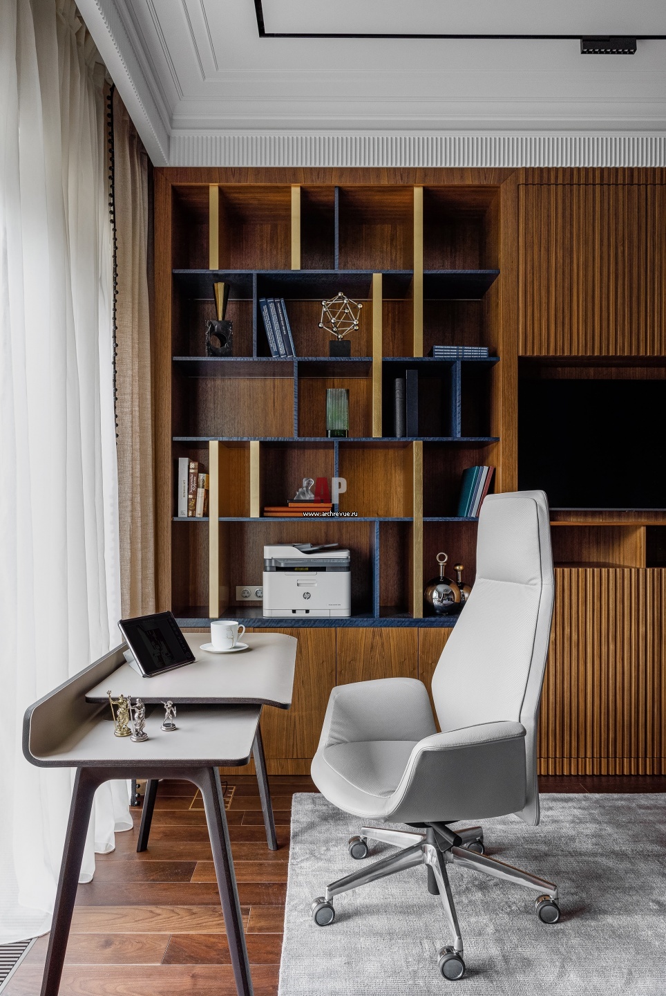 Рабочая зона в комнате мальчика. Стеллаж из американского ореха изготовлен по эскизам дизайнера. Стол и рабочее кресло, Poltrona Frau.