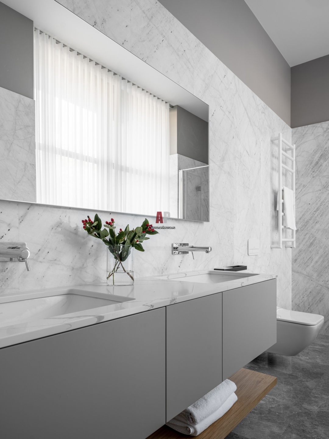 Хозяйская ванная комната. На стенах и полу – мрамор, Pietro Grigio. Столешница умывальника, Ligron. Сантехника, тумба под раковину, Villeroy & Boch. Смесители, Hansgrohe.