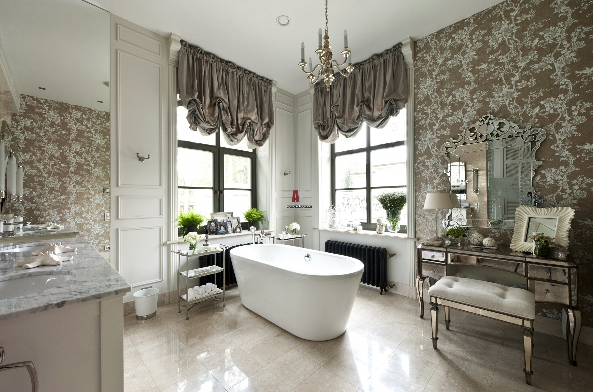 Интерьер ванной комнаты в серо-бежевых тонах в частном загородном доме.
