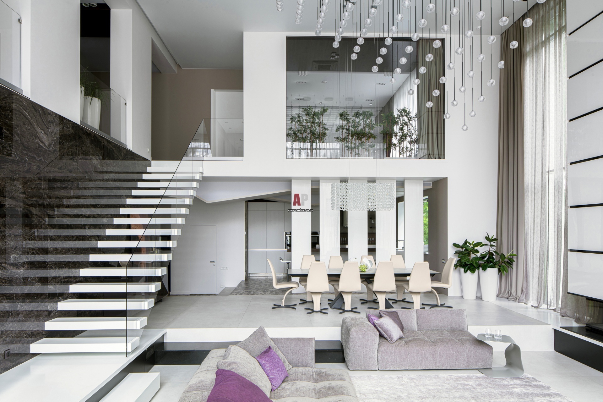 Двусветная гостиная. Зона кухни-столовой приподнята на небольшой подиум, который отделан белым искусственным камнем. Под основанием лестницы встроены ящики для хранения черного цвета, они контрастируют с белыми парящими ступенями и полом.
