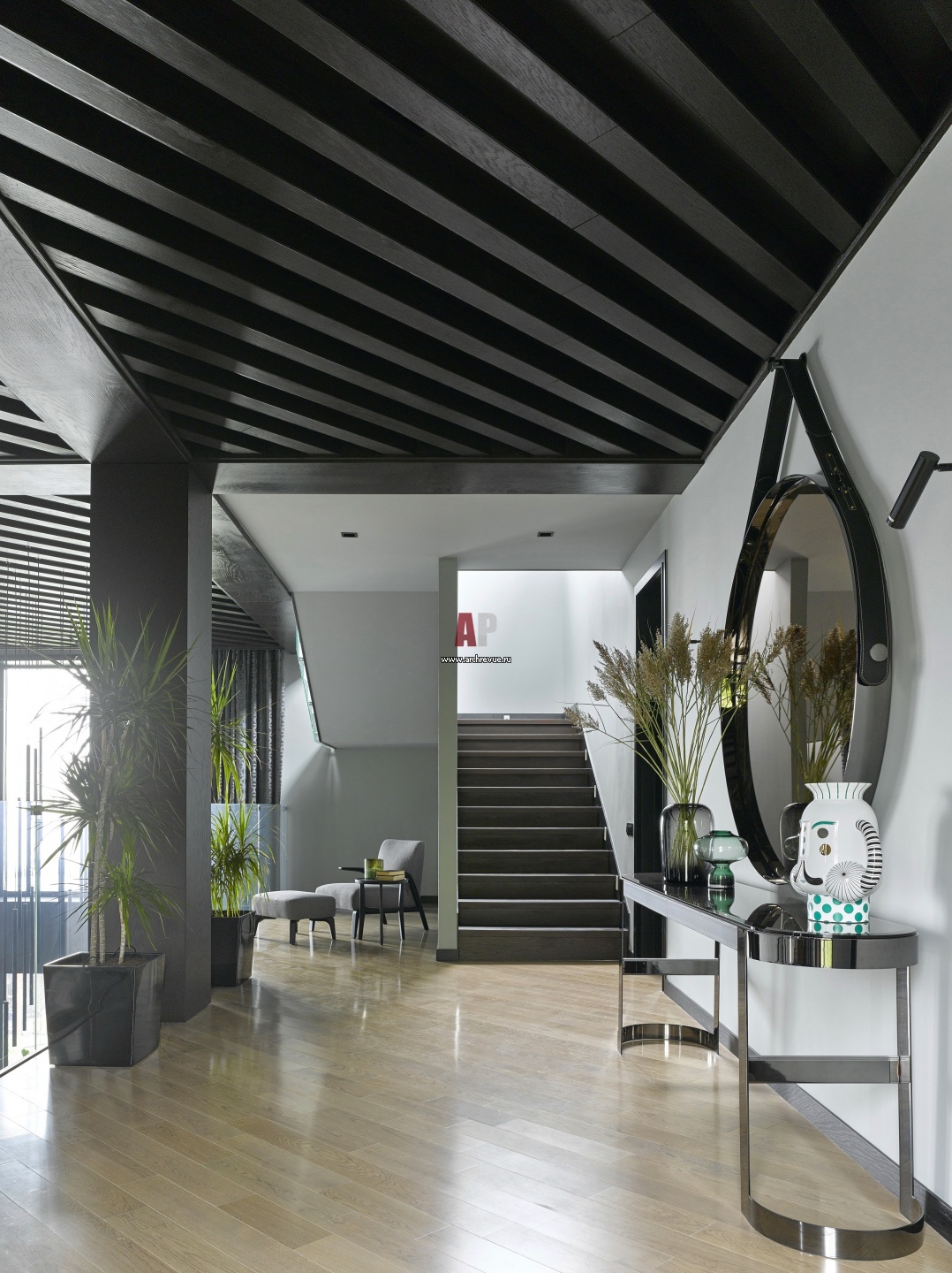 В холле второго этаже реечный потолок рифмуется с диагональной укладкой половой доски. Консоль и зеркало, Frigerio. Кресло и столик, Camerich.