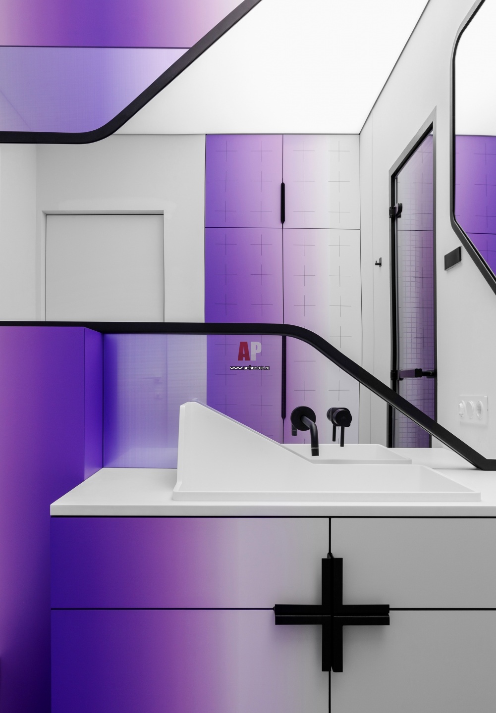 Хозяйский санузел оформлен в фиолетовой гамме с растяжкой по цвету.