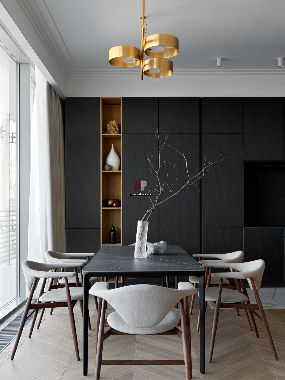 Кухня-гостиная. Обеденный стол, Sovet Italia. Стулья, Gubi. Люстра, Masiero.