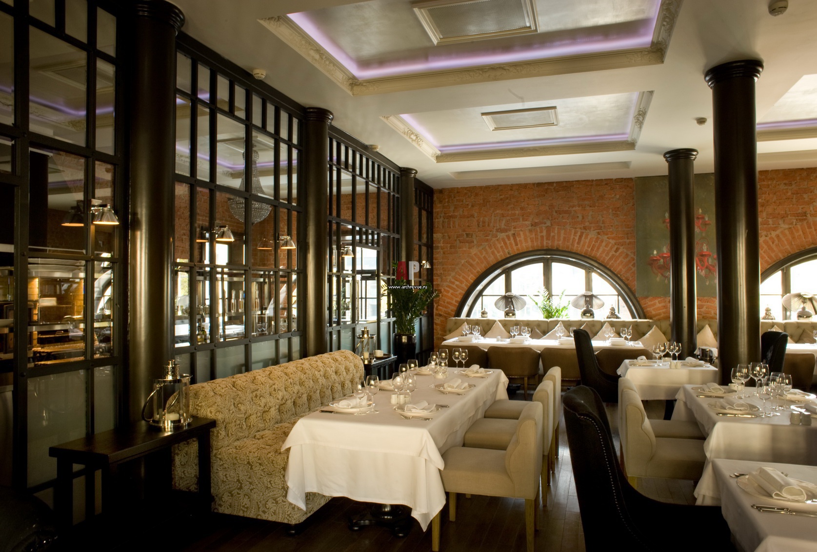 Кухня вынесена в основное пространство ресторана. От посадочных мест она отделена перегородкой из темного дерева со вставками из стекла, изготовление Beni.