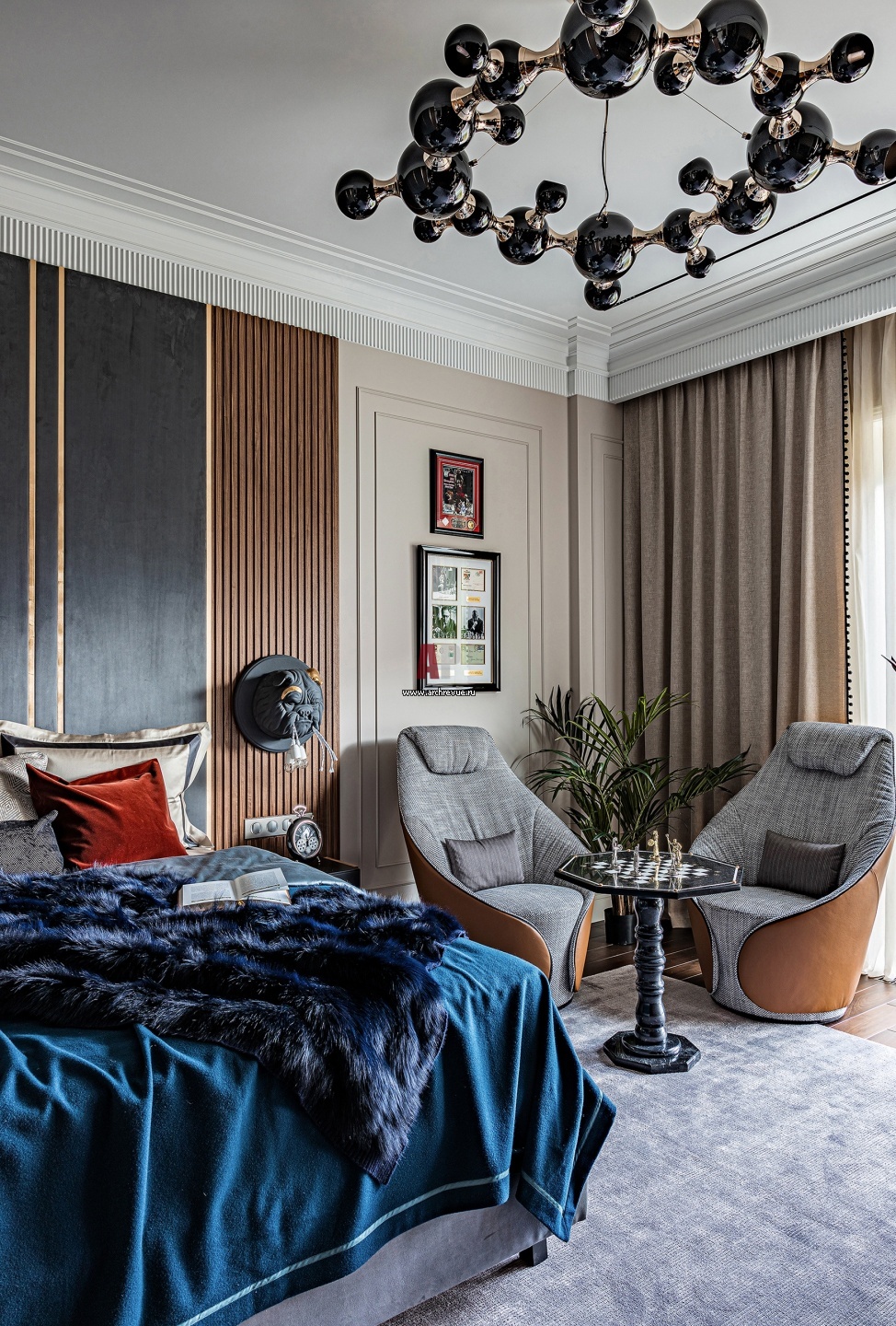 Спальня сына. На дальнем плане – шахматный столик: мальчик увлекается игрой в шахматы. Люстра-молекула, Delightfull