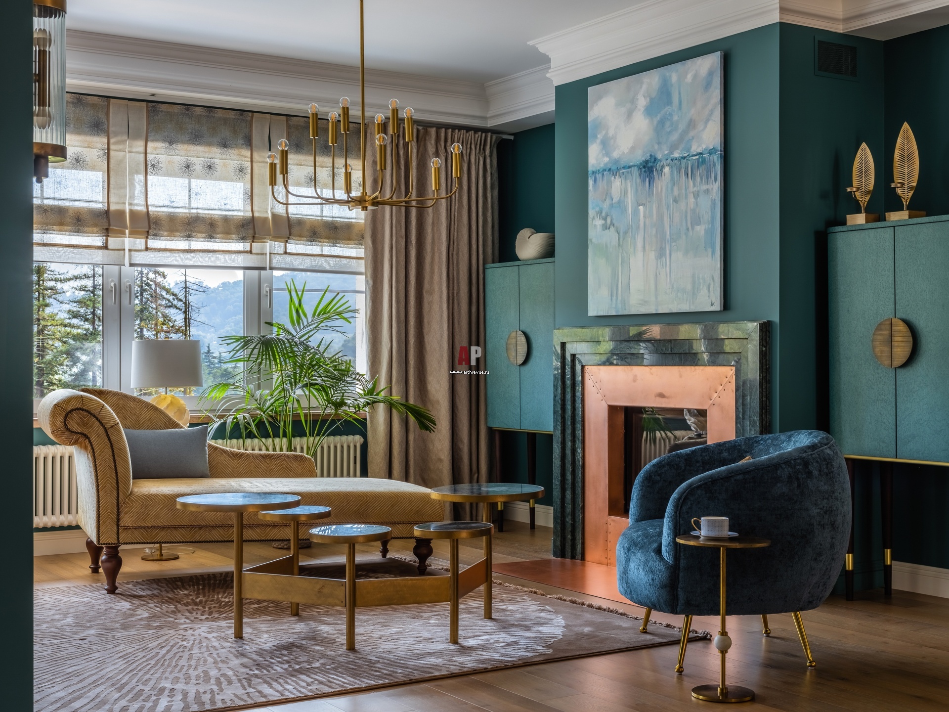 Стены в гостиной окрашены в глубокий сине-зеленый цвет. Коралловый, оливковый и охристый тона выбраны для обивок мягкой мебели. Диваны, Roy Bosh. Столики, светильники, Any Home.