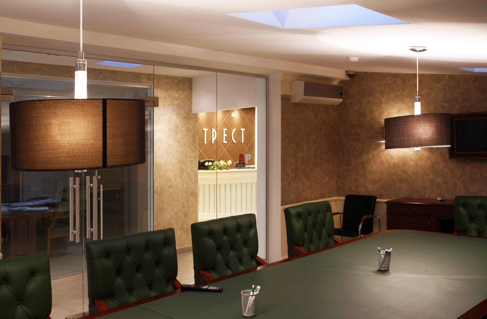 Переговорная на третьем этаже. Ее интерьер предельно функционален: основной объем занимает переговорный стол. Стеклянные перегородки, поставщик «Астарта ».