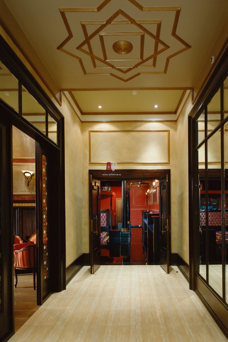 Холл с элементами восточного стиля. Напольный керамогранит имитирует мрамор сорта Крема марфил.