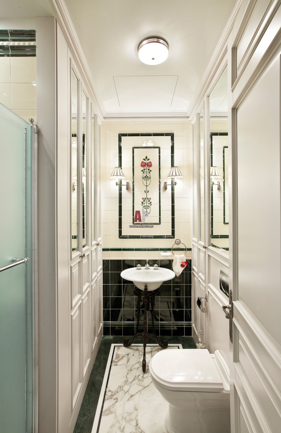 Интерьер гостевого санузла с английскими мотивами. Глазурованная плитка, Original Style. Раковина с кованым подстольем от Kohler. Унитаз, Villeroy & Boch.