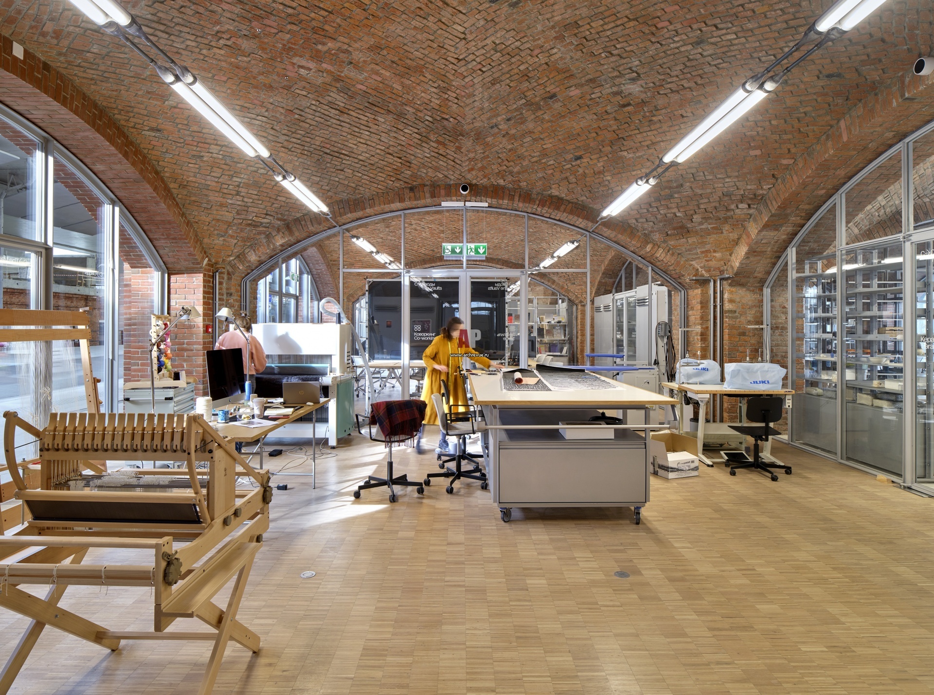 Одна из мастерских в отдельно стоящем корпусе «Своды». Каждый свод – помещение площадью около 60 кв. м с витражным остеклением и исторической кирпичной кладкой.