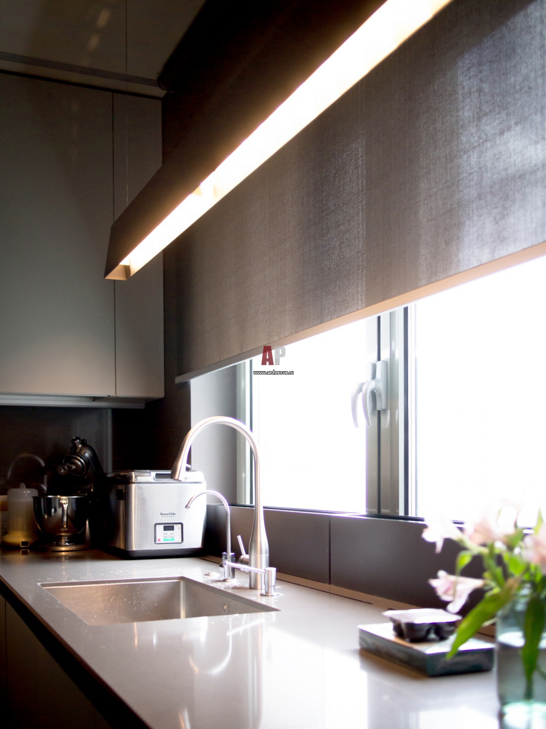 Интерьер кухни в минимализме. Мойка из нержавеющего металла расположена у окна в металлической раме. Длинный светильник, Viabizzuno.