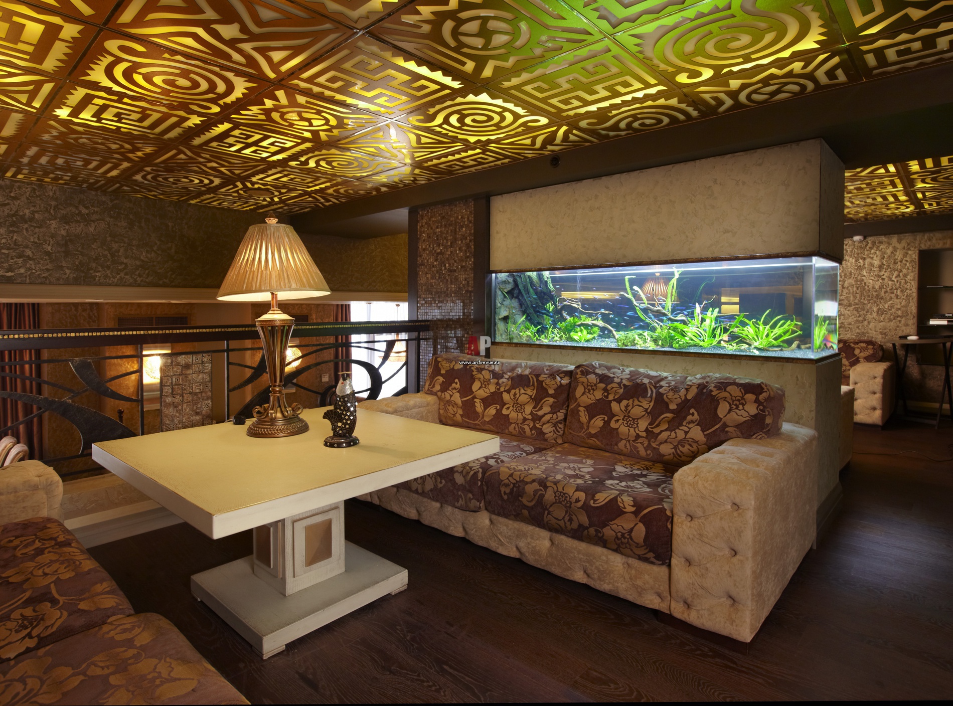 Зона лаунжа на втором уровне. Диванные группы зонированы аквариумом.