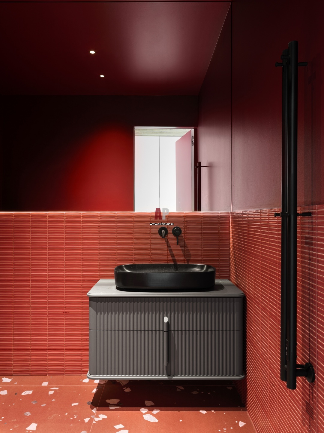 Красный гостевой санузел – единственный яркий цветовой акцент монохромного дома. На стенах – плитка, Wow, коллекция Sb Berry Matt. На полу – плитка, Ceramica Fioranese.