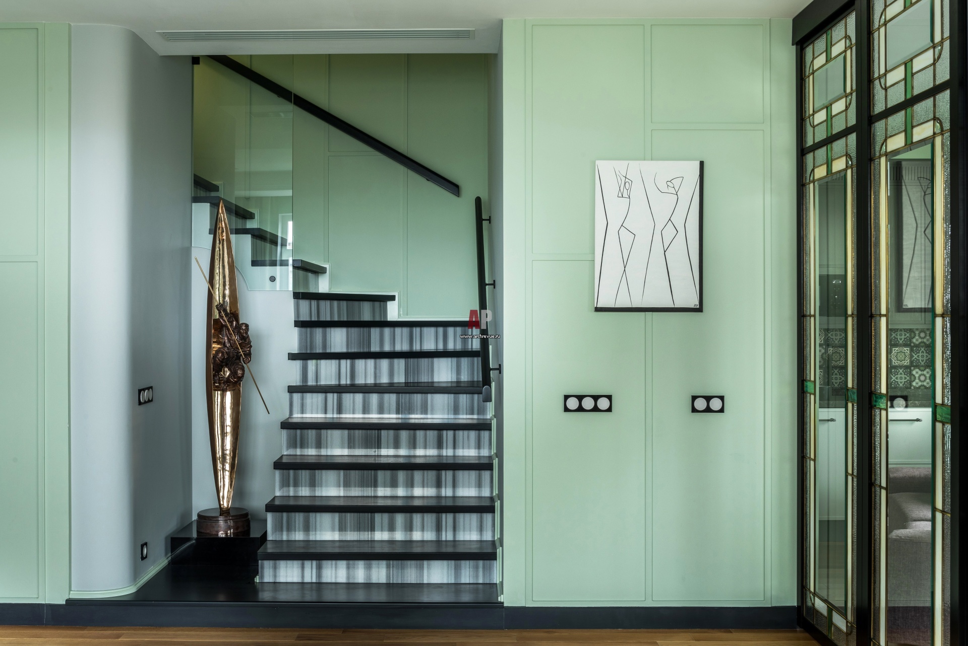 Дизайнеры расширили лестничный проем и создали удобную и эффектную лестничную группу. Стены выкрашены в нежный зеленый оттенок. Под лестницей спроектирована маленькая потайная кладовка (ее площадь составляет 2 кв. м).