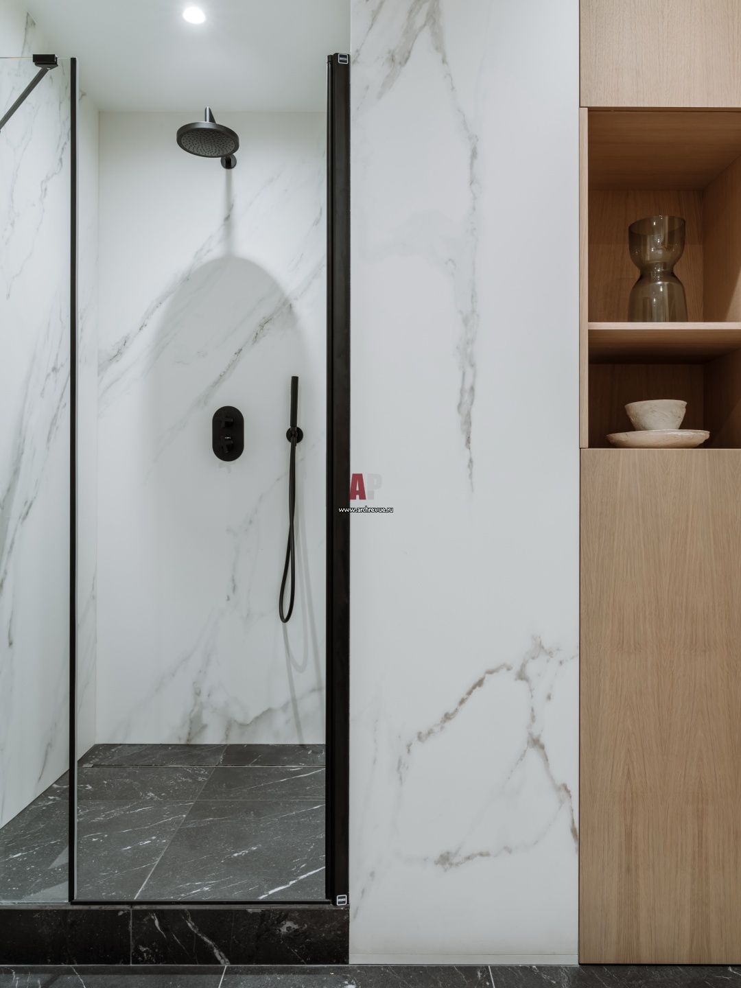 Душевая. На стенах – керамогранит с фактурой мрамора Калакатта, ITT Ceramic. На полу – черный керамогранит, FAP Ceramiche, коллекция Roma. Смесители, Teknobili.