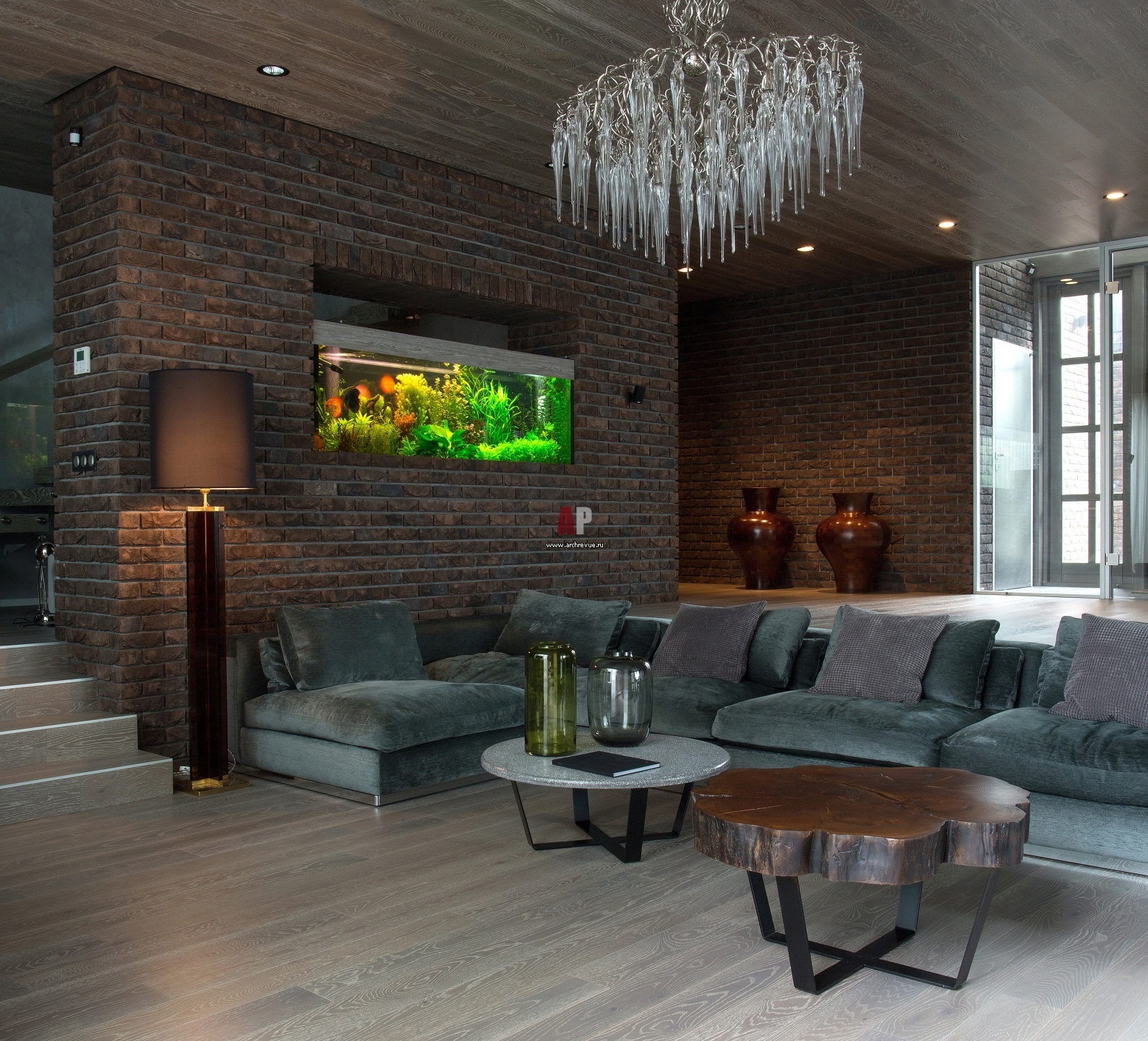 Входная зона и гостиная имеют разный масштаб, заданный высотой потолков. От лестничного холла диванную группу отделяет кирпичная стена с двухсторонним аквариумом.