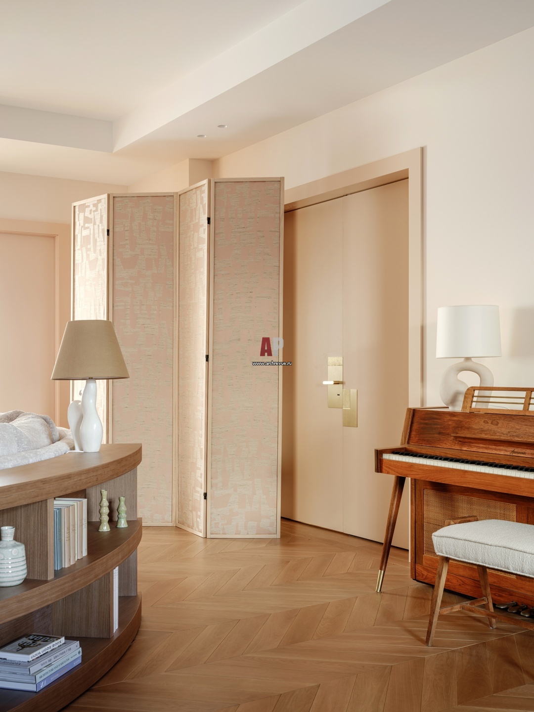 Розовый монохром. Квартира режиссера Василисы Кузьминой в Хамовниках. Гостиная. Ширма обита тканью Dedar. Дверные ручки, Olivari. Пианино, Baldwin Acrosonic, 1960-х годов.