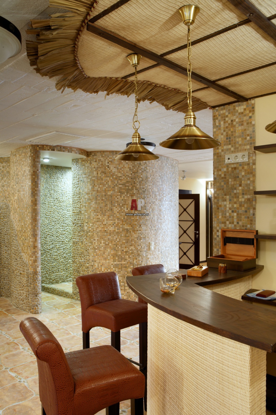 Зона бара при бассейне решена в восточном стиле. Потолок и стойка бара зашиты сизалем.