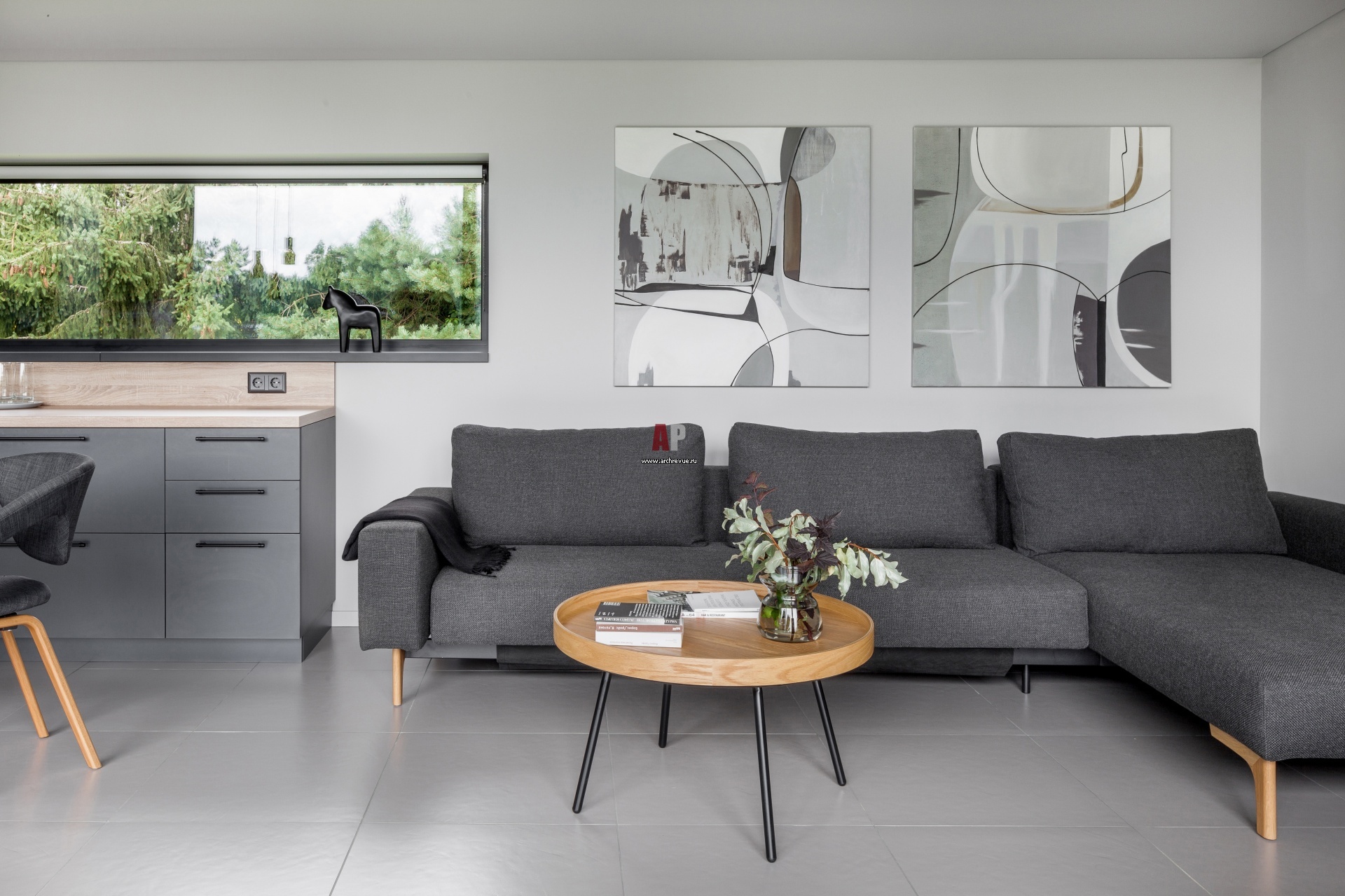 Современный каркасный дом из тонированной фанеры. Общая зона гостиой, кухни и столовой. Диван, Innovation Living. На стенах – штукатурка светло-серого цвета под цемент, Oikos.