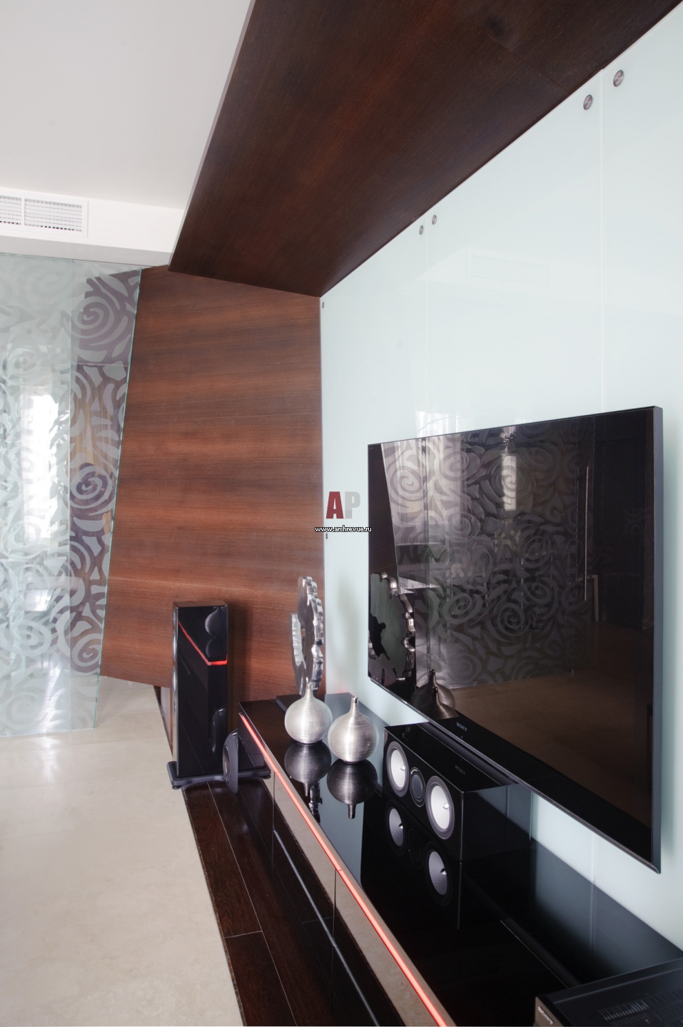 Фрагмент домашнего кинотеатра в стиле деконструктивизм. Авторы проекта Петр Зайцев, Арсений Борисенко, архитектурное бюро za bor. Стойка под ТВ Interluebke со светодиодной подсветкой.