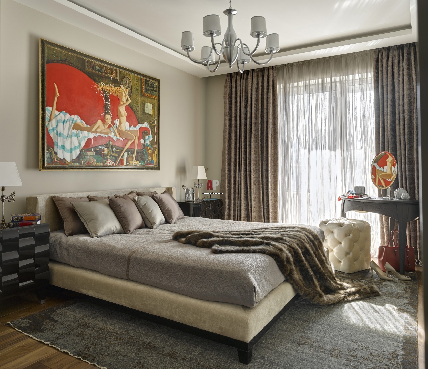 Интерьер спальни в светлой серо-бежевой гамме. Кровать, тумбочки, туалетный столик, плед из натурального меха, Fendi. Над кроватью – яркое живописное полотна художника Романа Заслонова.