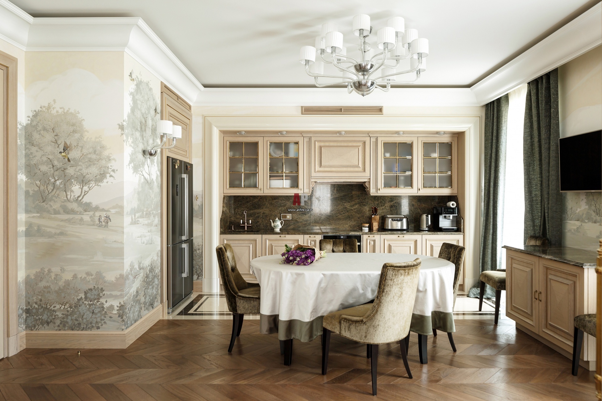Центральный декоративный мотив кухни – авторская роспись с пасторальным сюжетом в приглушенных тонах. Кухонный гарнитур цвета слоновой кости сделан на заказ.