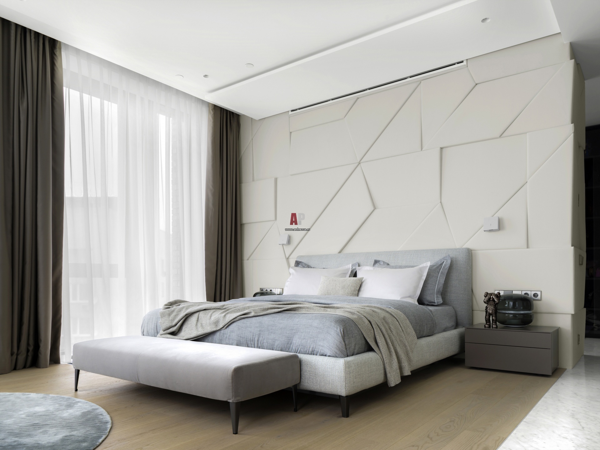 Хозяйская спальня оформлена в светлых тонах, ее площадь – 25 кв. м. Стена за кроватью зашита рельефными геометрическими панелями из алькантары. Кровать, Minotti. Банкетка, Maxalto. Прикроватные тумбочки, Porro.