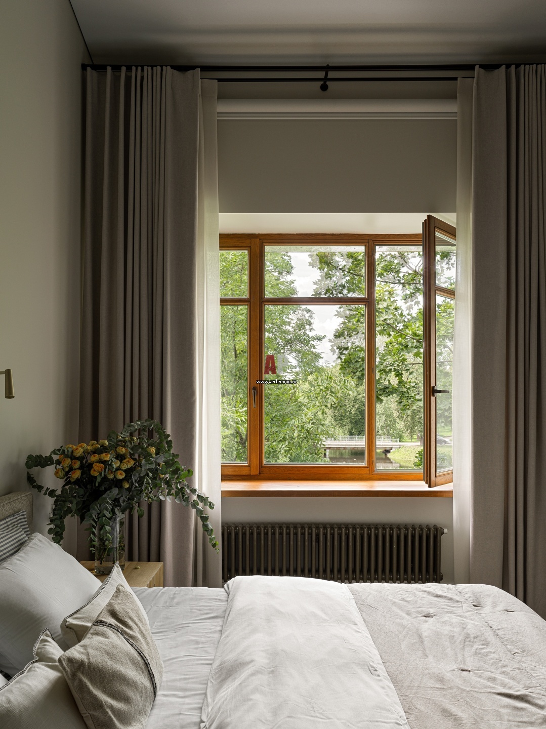 Спальня. Стены всех помещений в квартире окрашены в один цвет, но в зависимости от окружения от выглядит по-разному. Кровать с мягким изголовьем Meridiani, модель Stone.