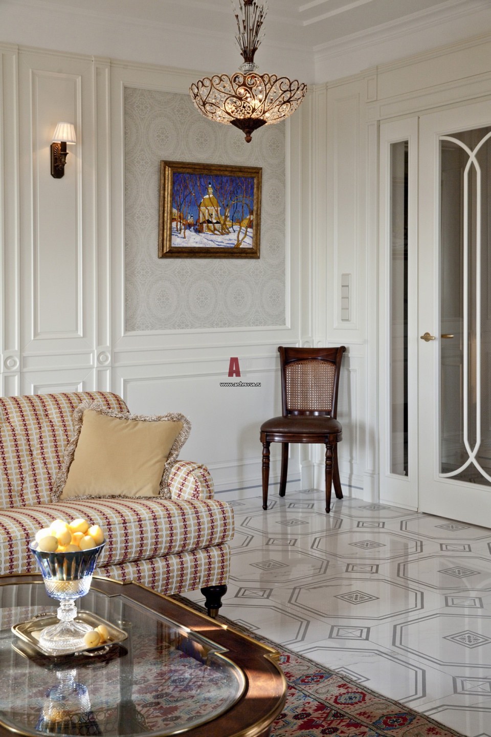 Гостиная. На полу – плиты из светлого мрамора с инкрустацией.