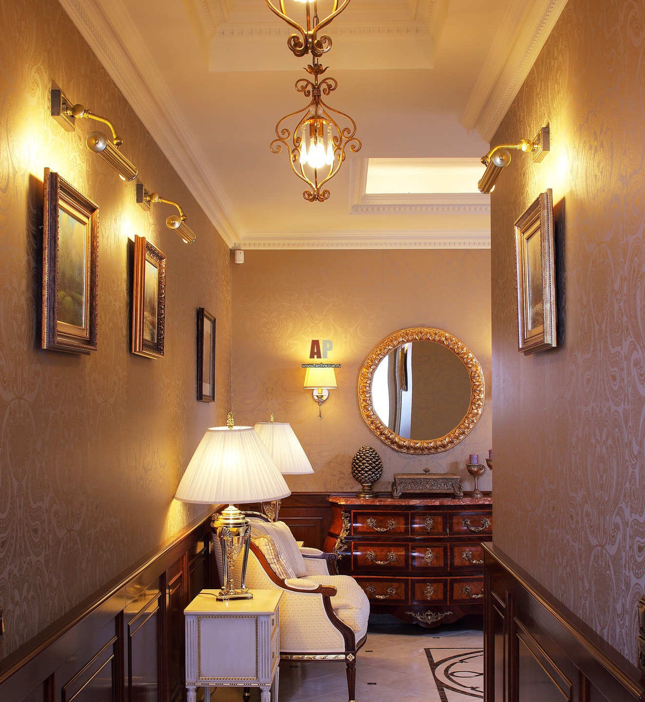 Нижние части стен в прихожей облицованы панелями из шпонированного ореха с эффектом состаренного дерева.