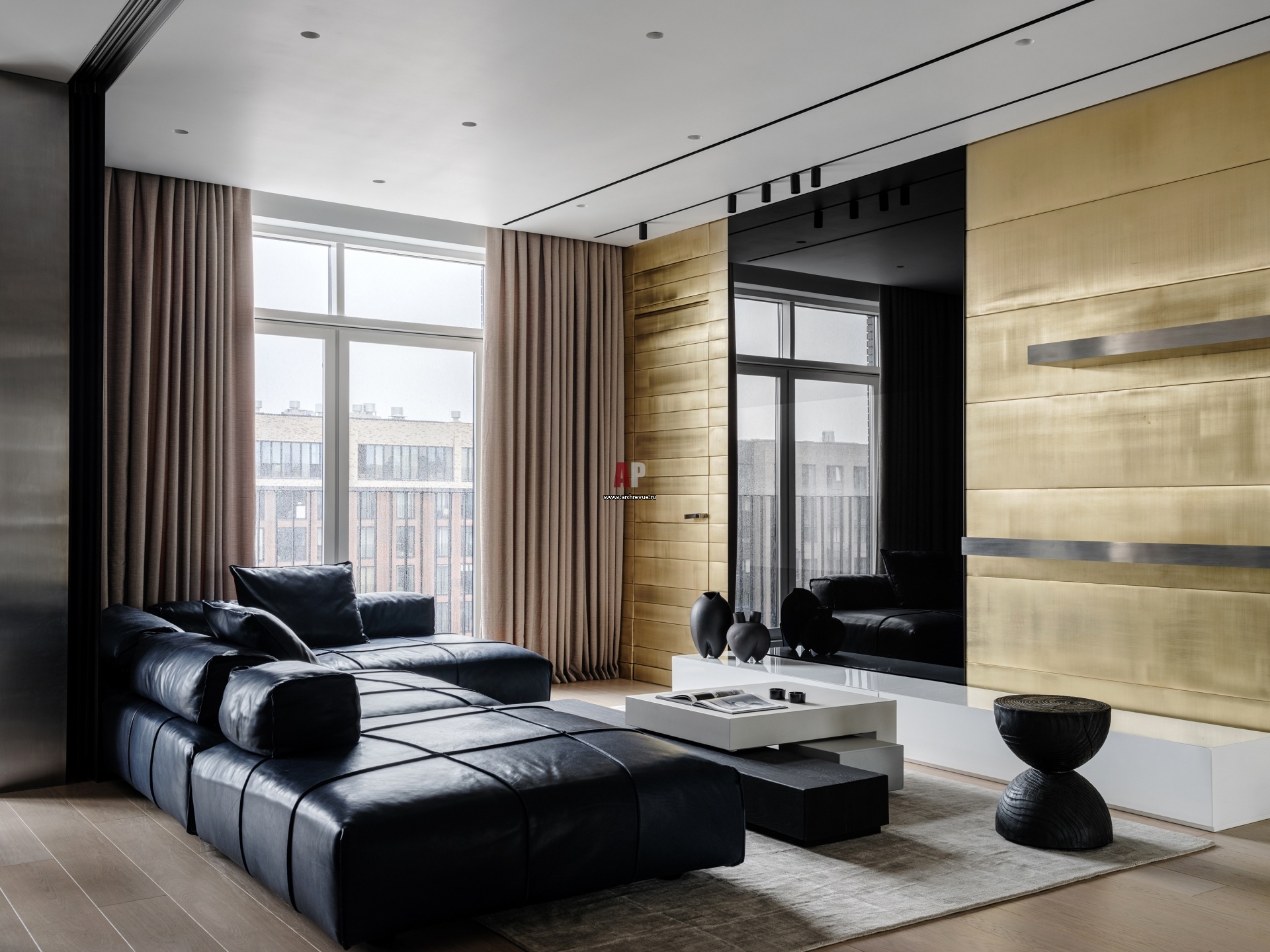 Гостиная. Стена с ТВ отделана панелями из шлифованной латуни с полками из нержавейки. Панелями замаскирована дверь на лоджию, через которую можно пройти в спальню.