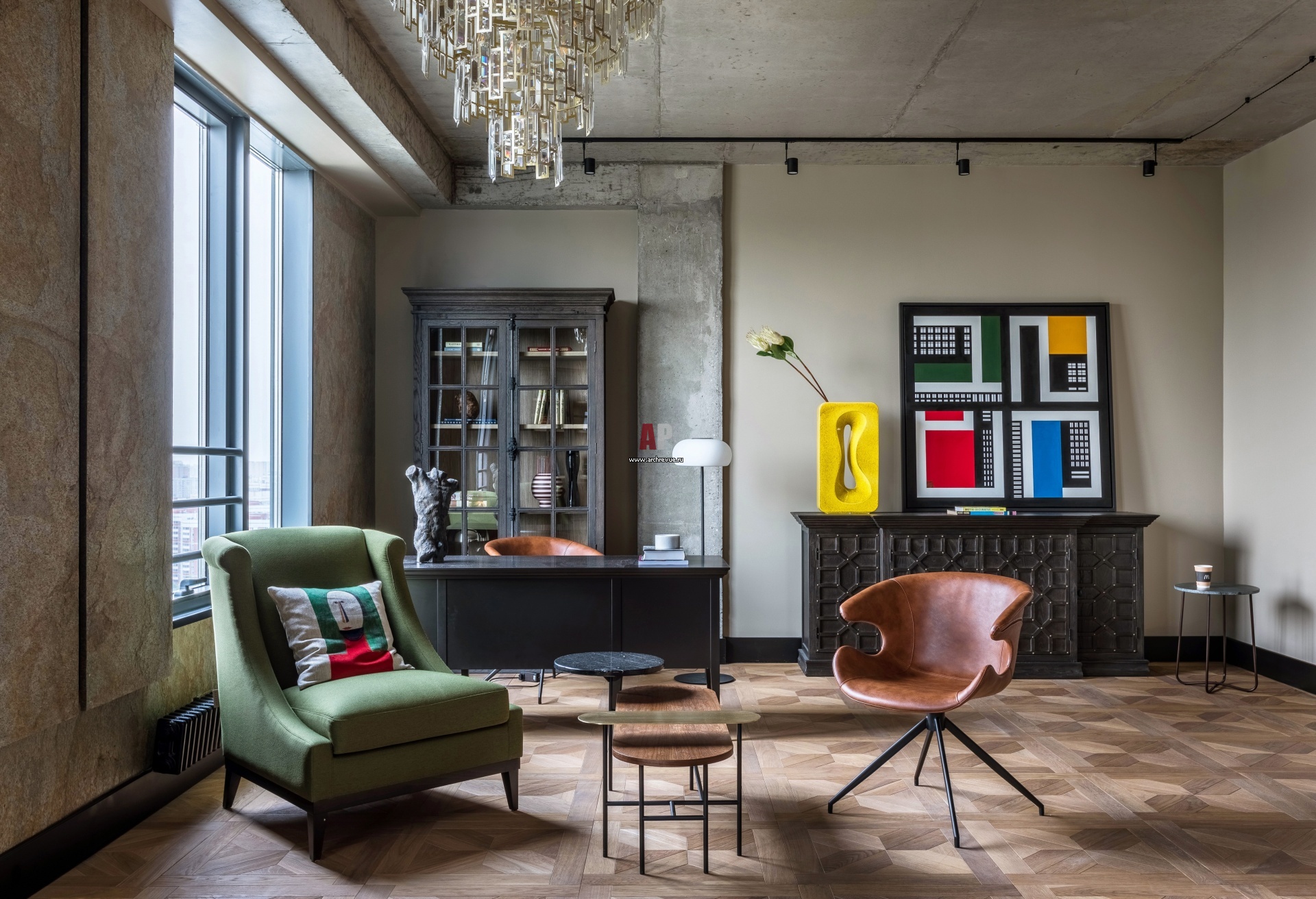 Интерьер квартиры-студии с необработанным бетоном и деталями в стиле ретро.
