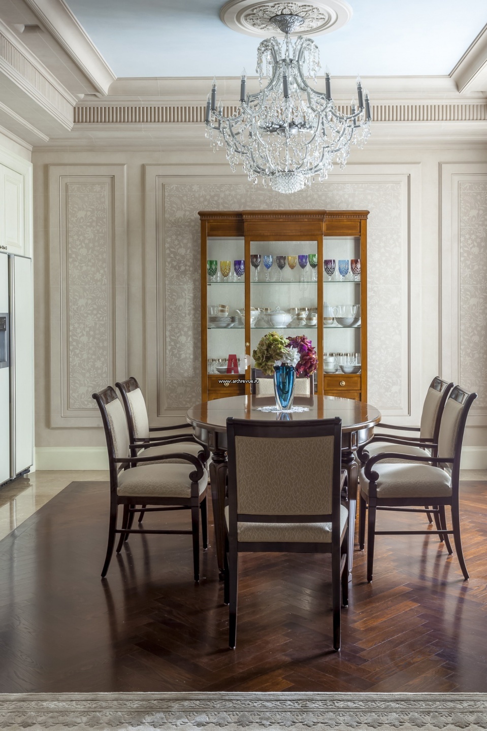 Интерьер столовой в стиле неоклассика. Обеденный стол из массива ореха.