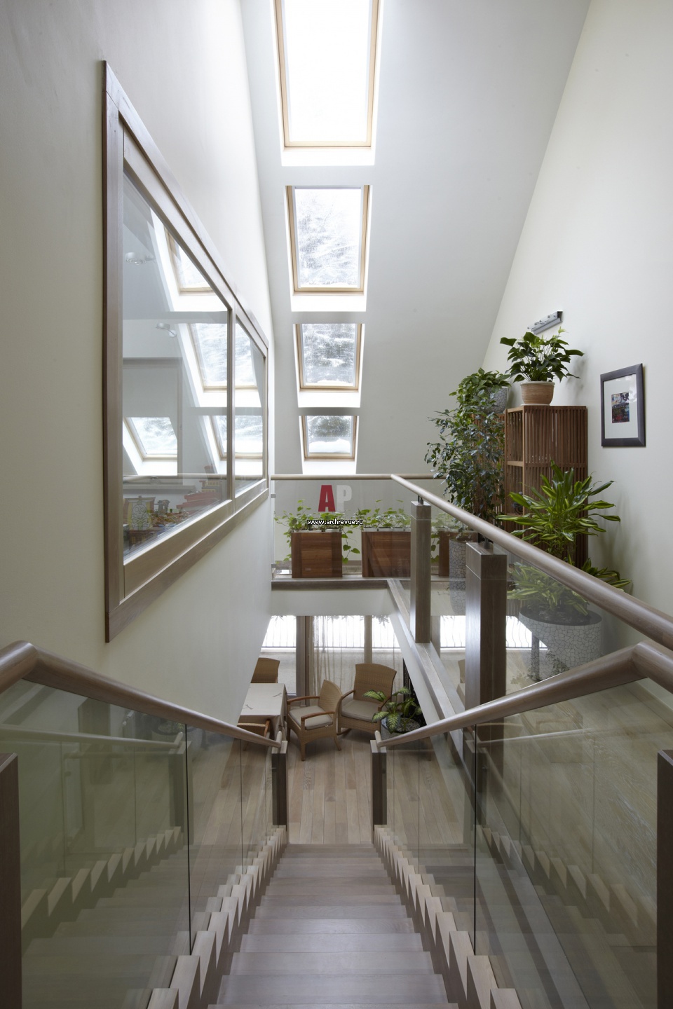 Лестничный холл третьего этажа, где находятся приватные помещения и спальни. Сложная кровля со скосом с рядом мансардных окон VELUX. Окна дают дополнительный естественный свет.