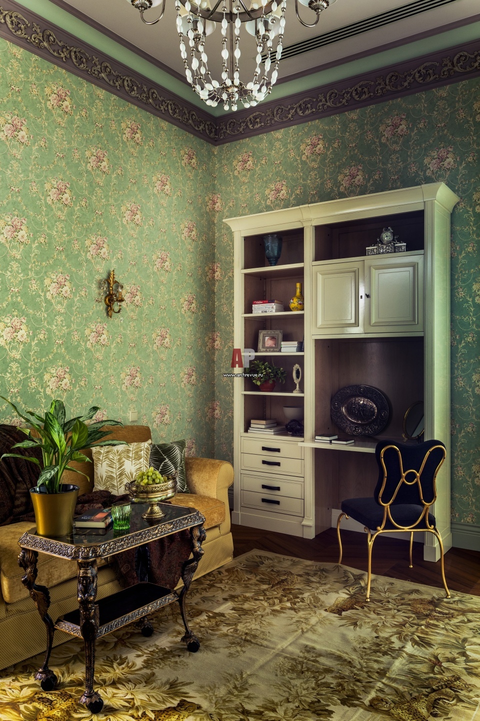 Гостевая спальня в зеленой палитре. Обои с цветочным орнаментом, KT Exclusive, серия Casa Fiori. Диван, Tosconova, модель Todi. Библиотека, AM Classic, модель Boheme. Стул, Henredon, модель Cassandra.