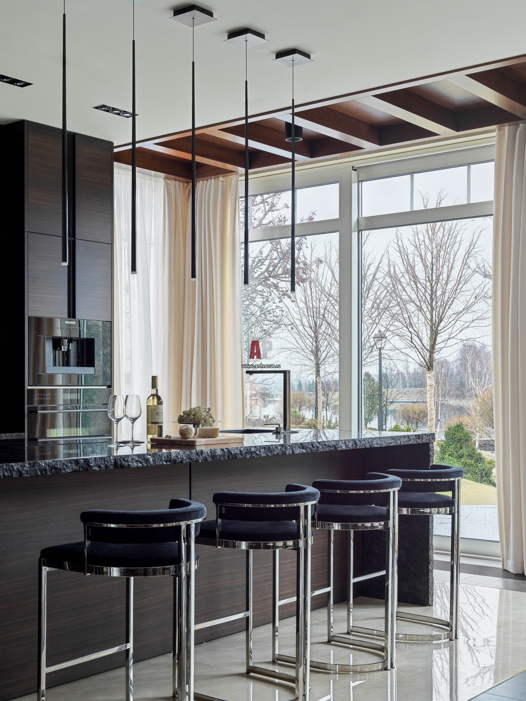 Столешница барного острова выглядит брутально, она выполнена из слэба гранита толщиной 6 см с колотым краем. Барные стулья, Eichholtz.
