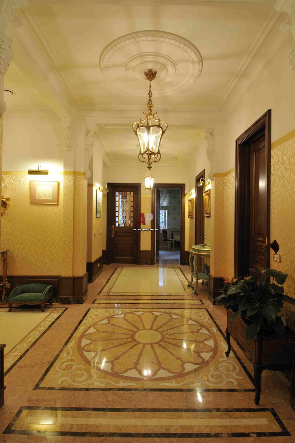 Одной из главных особенностей оформляемого пространства стала высота потолков. Поэтому основной задачей автора было создание пропорциональных тональных объемов в интерьерах всех без исключения зон. В холле высота подчеркнута уровнем обоев и низкой деревянной панелью внизу. На полу мрамор с несложным рисунком.