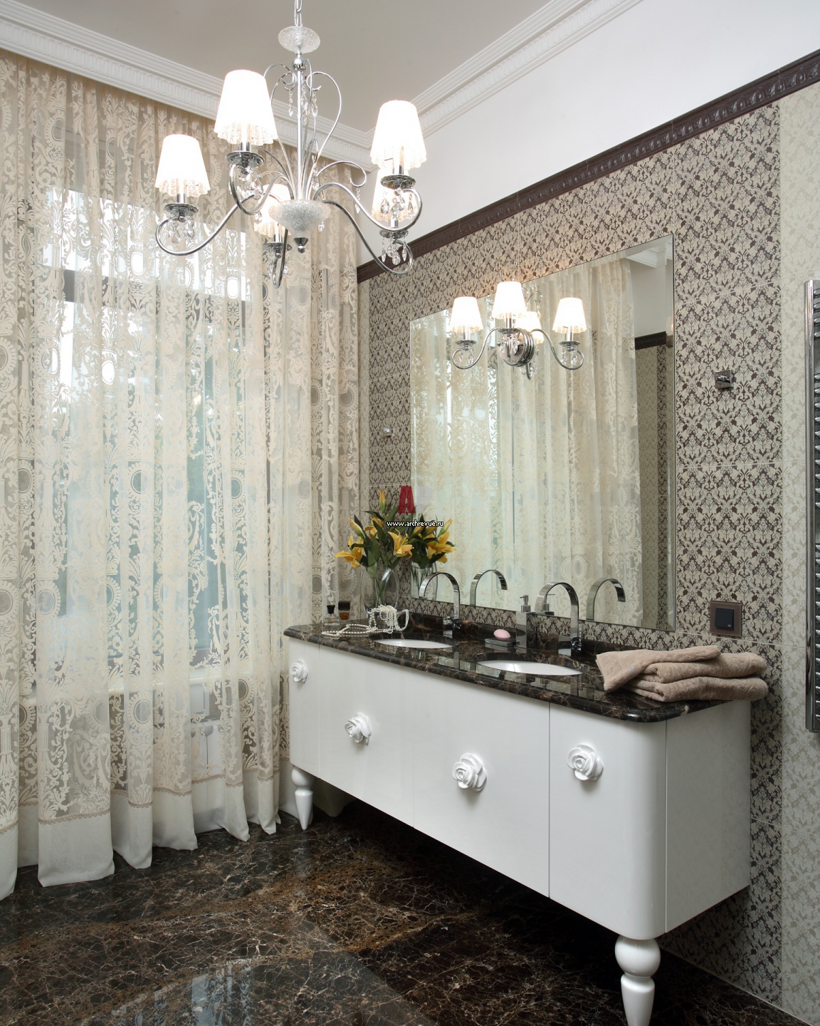 Фото интерьера ванной комнаты квартиры с элементами стиля гламур. Белая консоль умывальника украшена розами. На стенах – керамическая плитка с неоклассическим орнаментом.