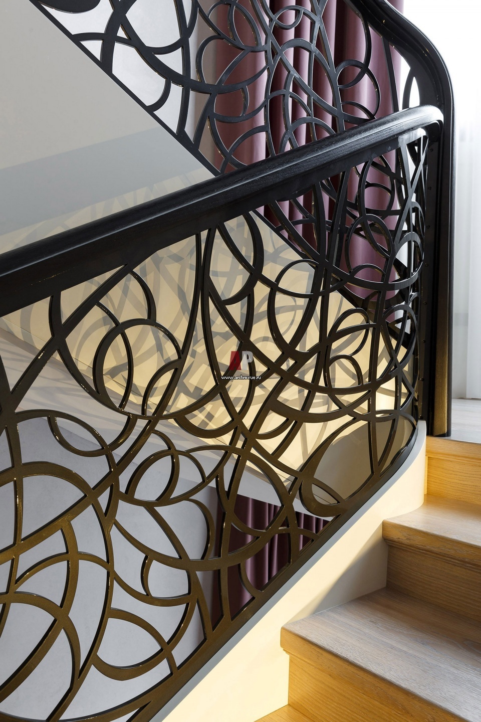 Ограждение лестницы с «текучим» рисунком выполнено из металла по эскизам архитекторов.