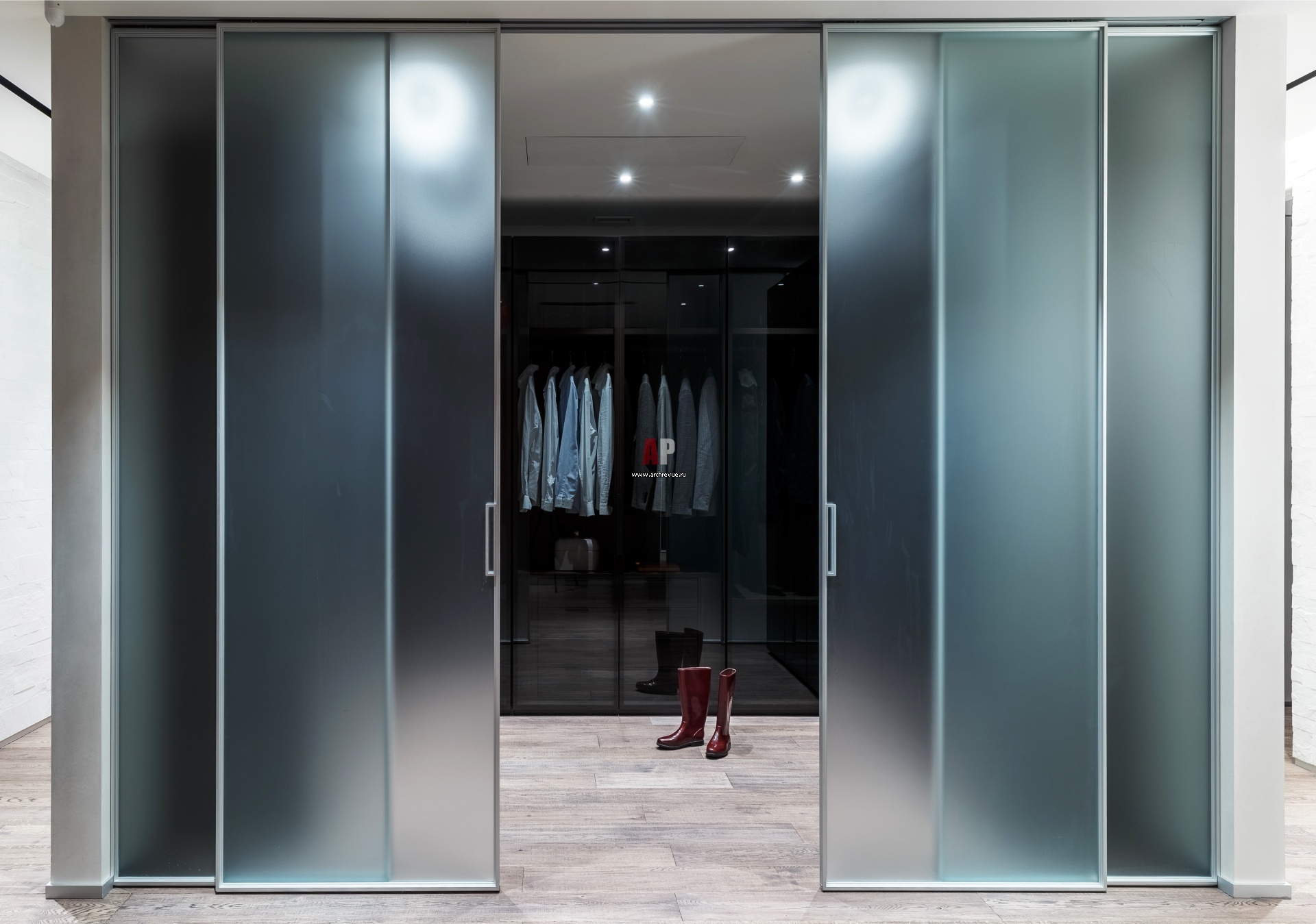 Семейный пентхаус в Хамовниках. За стеклянными раздвижными дверями Rimadesio – гардероб для верхней одежды.