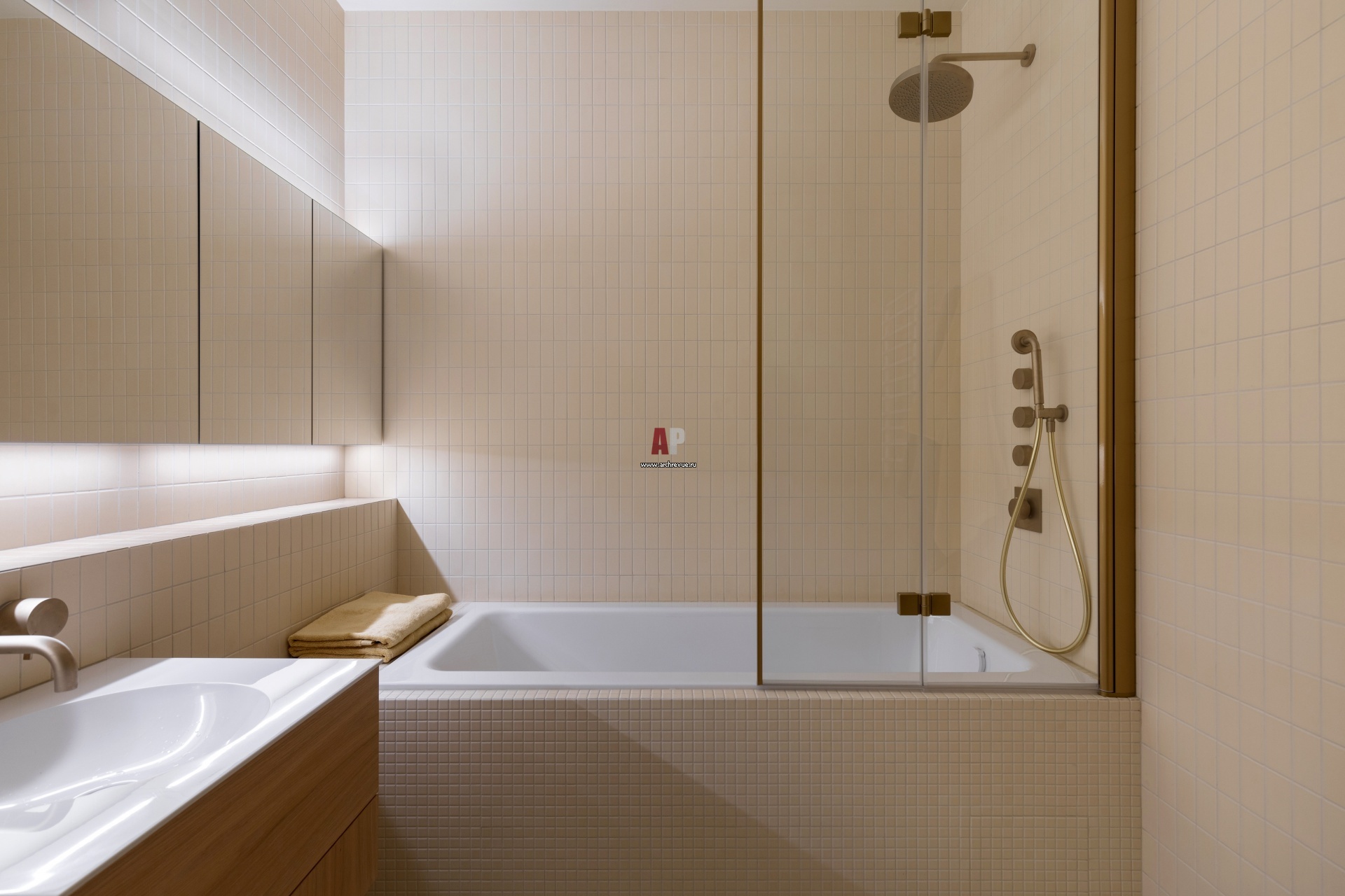 Детская ванная оформлена лаконично. Стены, пол, фасад ванны облицован керамической мозаикой разного размера. Душевая перегородка с профилем и стабилизатором из анодированного алюминия, Kermi. Раковина, Burgbad. Смесители, Fantini. Ванна, Bette.