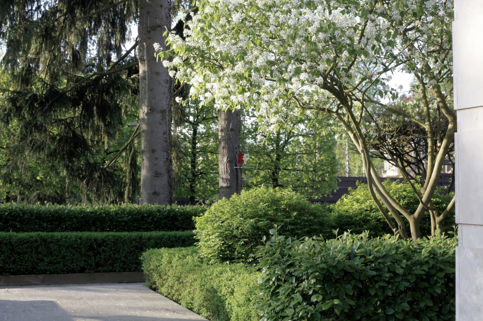 Вход в дом подчеркнут строгостью линий зеленых карманов, в обрамлении из спиреи японской. А в наполнении – роскошные ирги с россыпью шаров бересклета.