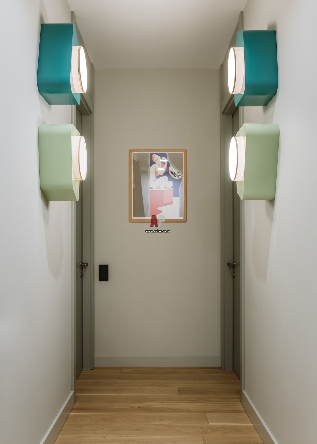 Квартира для семьи с детьми. Интерьер коридора с зелеными бра.