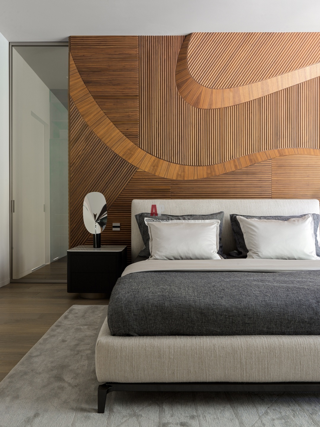 Дом с высокотехнологическими решениями и материалами. Интерьер мастер-спальни на втором этаже.