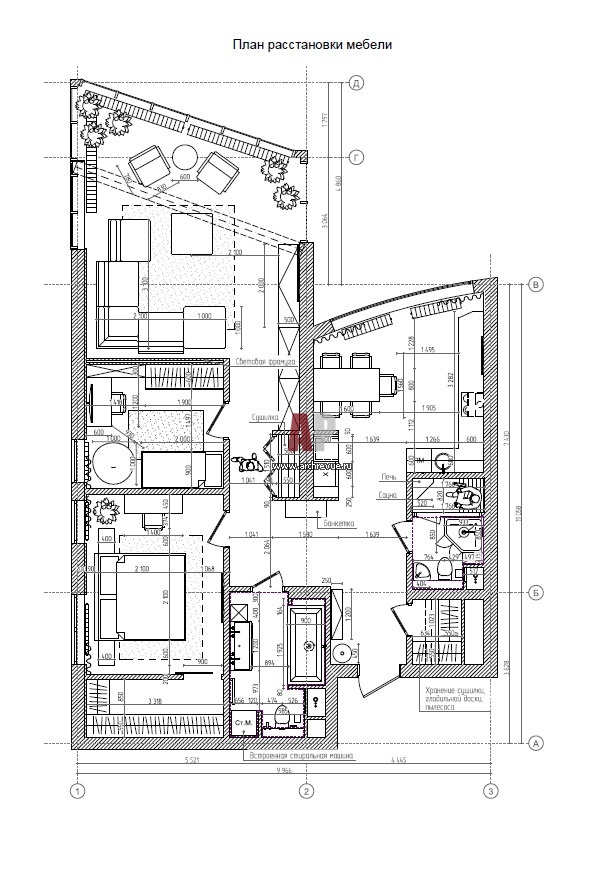 План 3-х комнатной квартиры с расстановкой мебели в ЖК «Олимпийская Деревня Новогорск». Общая площадь – 112 кв. м.