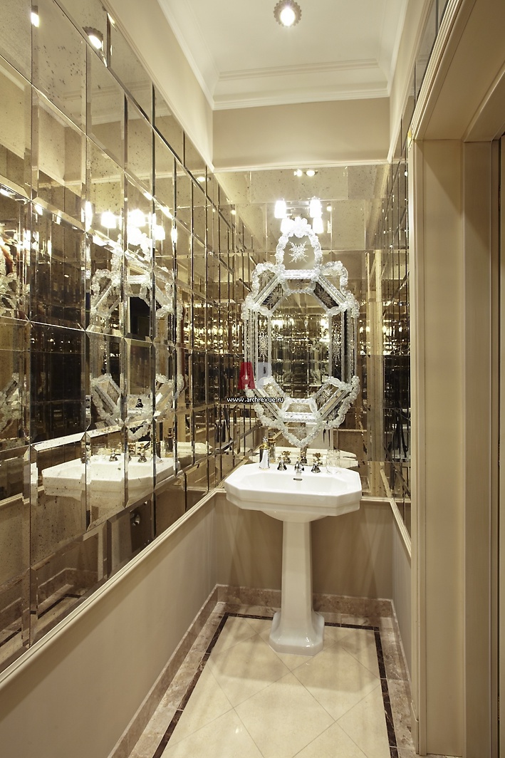 Стены санузла облицованы плиткой Petris 5 из состаренного зеркала с широкими фацетами. Поверх зеркал авторы проекта повесили еще одно зеркало – венецианской работы с гравировкой.