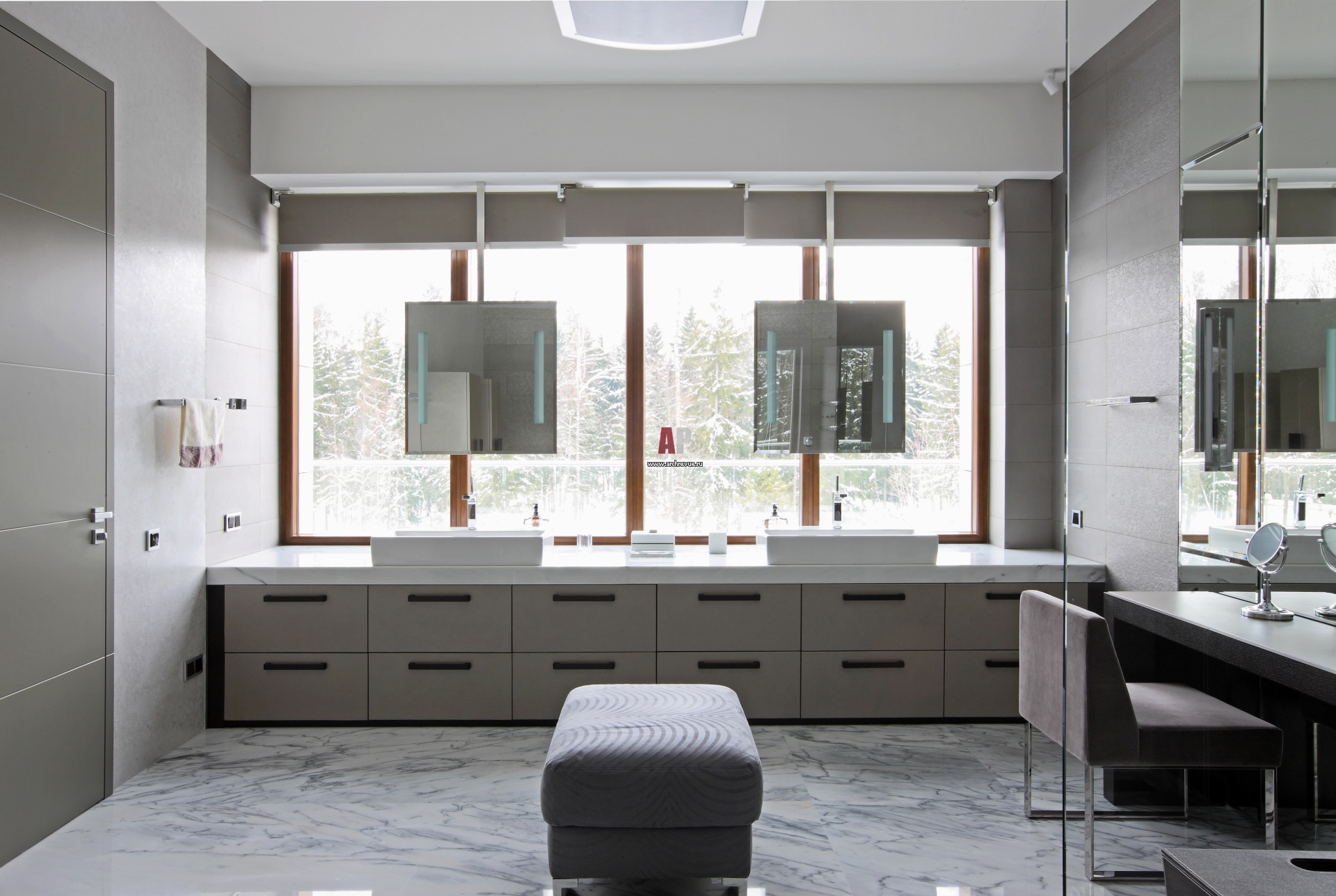 На фото – интерьер санузла. Два умывальника встроены в общую столешницу и размещены вдоль панорамного окна.