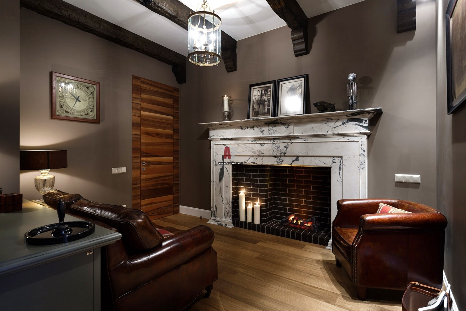 Зона камина в кабинете. Топка электрического камина облицована кирпичом и обрамлена массивным мраморным порталом. Эффект живого пламени достигается благодаря принципу испарения воды. Черные потолочные балки носят декоративный характер.